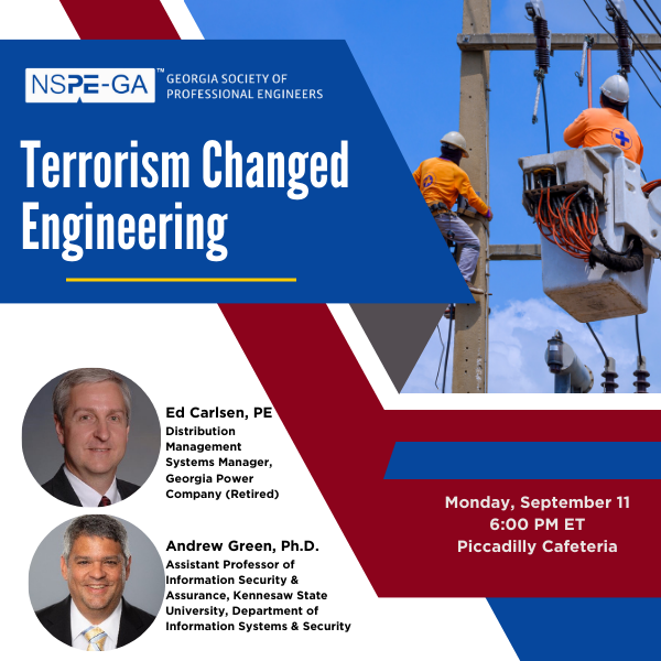 The September 11th face-to-face monthly dinner meeting of the Georgia Society of Professional Engineers Atlanta Metro Chapter will feature a Terrorism Changed Engineering. panel discussion. The panelists, all experts in their respective fields, include Ed Carlsen, PE, retired Distribution Management Systems Manager for Georgia Power Company, and Andrew (Andy) Green, Ph.D., Assistant Professor of Information Security and Assurance, Kennesaw State University, Department of Information Systems and Security will share their insights how things have changed.
